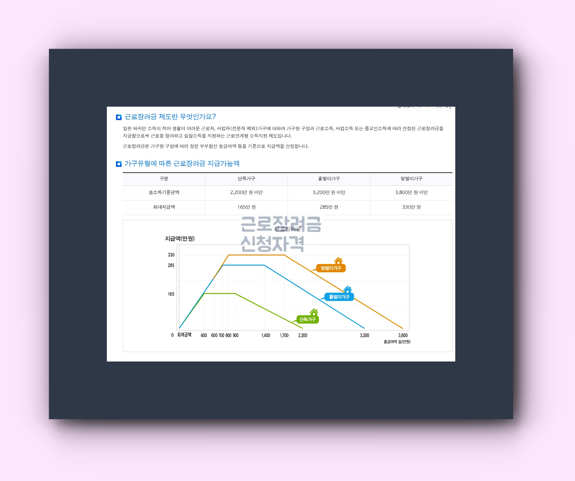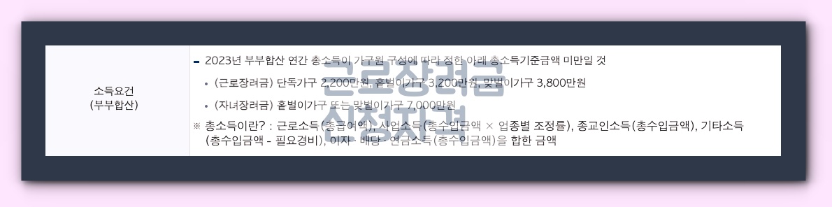 근로장려금: 단독가구는 2,200만원, 홑벌이가구는 3,200만원, 맞벌이가구는 3,800만원입니다.
