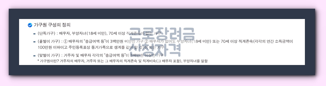 - 맞벌이가구: 신청인과 배우자의 각각의 총급여액이 300만원 이상인 가구입니다.