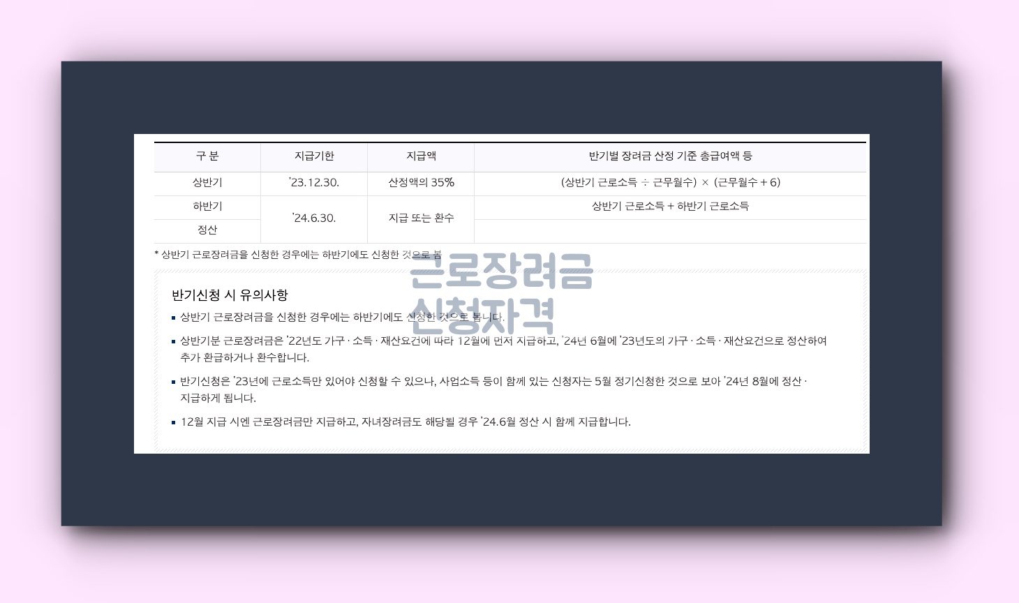 - 반기 신청: 2023년 9월 1일부터 9월 15일, 2024년 3월 1일부터 3월 15일까지 진행됩니다.