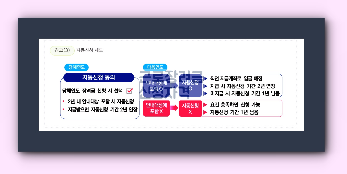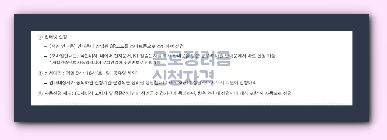 대리 신청 및 자동 신청 제도가 있습니다. 특히 60세 이상의 고령자나 중증 장애인을 위한 자동 신청 제도가 마련되어 있어 신청 기간 동안 동의만 하면 됩니다.