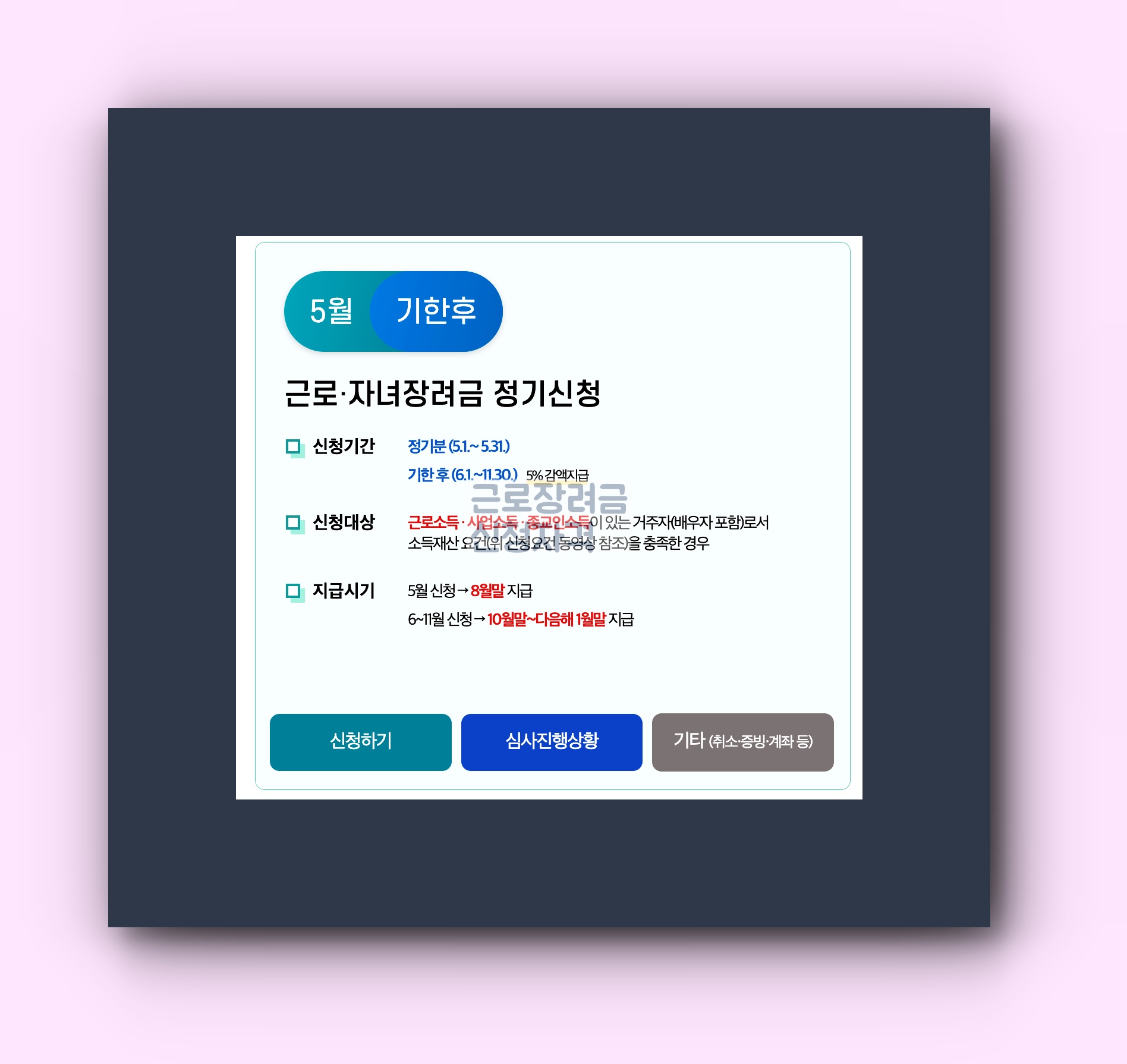- 정기 신청: 2024년 5월 1일부터 5월 31일까지 모든 소득 유형에 대해 가능합니다.
